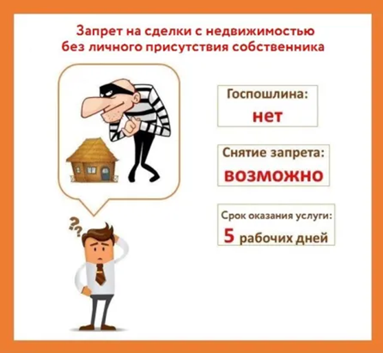 Запрет на сделки с недвижимостью без личного участия — это мера защиты от мошенничества, которую владелец жилья устанавливает по своему желанию. После установки запрета в Едином государственном реестре недвижимости (ЕГРН) появляется особая отметка. С её наличием ведомство не сможет выполнить переход права на недвижимость другому лицу без участия собственника. Действие запрета распространяется на следующие виды сделок: Установить запрет можно онлайн на портале «Госуслуг». Для этого необходимо подать заявление о запрете государственной регистрации перехода, прекращения, ограничения права и обременения объекта недвижимости без личного участия собственника. Из документов потребуются: паспорт; ИНН; кадастровый номер объекта недвижимости. Заявление подписывается с помощью УКЭП в приложении «Госключ». Запрет регистрации будет внесён в ЕГРН в течение пяти рабочих дней со дня приёма заявления. Если нет усиленной квалифицированной электронной подписи (УКЭП) или её не хотят оформлять, то установи