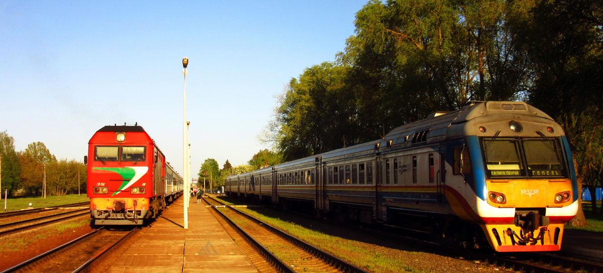 Прибытие на станцию Василевичи. Нас снова ожидает импозантный латвиец ДР1Б сообщением Калинковичи - Гомель. Ждёт, когда, наконец, освободится дорога (до Сталина линия была двухпутной, второй путь сняли и, вероятно, увезли на какую-нибудь гулаговскую стройку. С тех пор поезда вынуждены друг друга пропускать, что снижает скорости передвижения. Хотя сама по себе линия содержится в полном порядке. Скорость до 100 км\ч. На однопутках РЖД так очень мало где можно разогнаться).