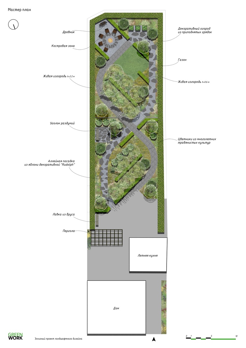 Общая площадь участка составляет 976 кв.м., из которых 685 кв.м. отведены под озеленение. Концепция сада разработана для семьи средних лет. Заказчики – люди с разносторонними интересами, ценящие искусство. Важным условием было создание зоны отдыха с открытым огнем и придание саду большей камерности. В планировке сада использован прием с аллеями. Несмотря на вытянутую форму участка, такое решение позволило визуально расширить пространство и создать интересные перспективы. В саду прослеживается символ бесконечности, сформированный двумя дорожками, напоминают о гармонии между движением и созерцанием. Одна, строгая и упорядоченная, вымощена плиткой, символизируя целеустремленность. Она ведет вперед, сквозь цветущий хаос. Другая, мягкая и податливая, из гранитного отсева, усеяна осколками плитняка. Она позволяет замедлиться, прислушаться к собственным шагам, приглядеться к текстурам и фактурам растений. Замкнутый контур приглашает к непрерывному исследованию внутреннего и внешнего мира, от
