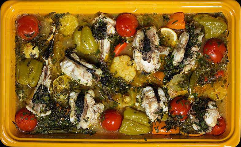 Но все точно по пословице - не так уж страшен черт, как его малюют. Особенно, если покупать морского черта в виде филе без головы. Голова у него огромная, есть там нечего, поэтому привозят вот такие тушки. Костей практически нет, филе плотное, рыба очень вкусная. Но начинается все с лука и чеснока. Обжарьте лук с чесноком до прозрачности, добавьте немного куркумы, а по желанию еще и паприки. Посолите. Переложите в форму для запекания. Поверх лука уложите куски рыбы, болгарский перец и чили, помидоры и лимон. Если шкура у каких-то лимонов горчит - снимите ее, если нет, можно положить дольками, вместе с цедрой. Густо присыпьте зеленью: базиликом, кинзой, петрушкой.