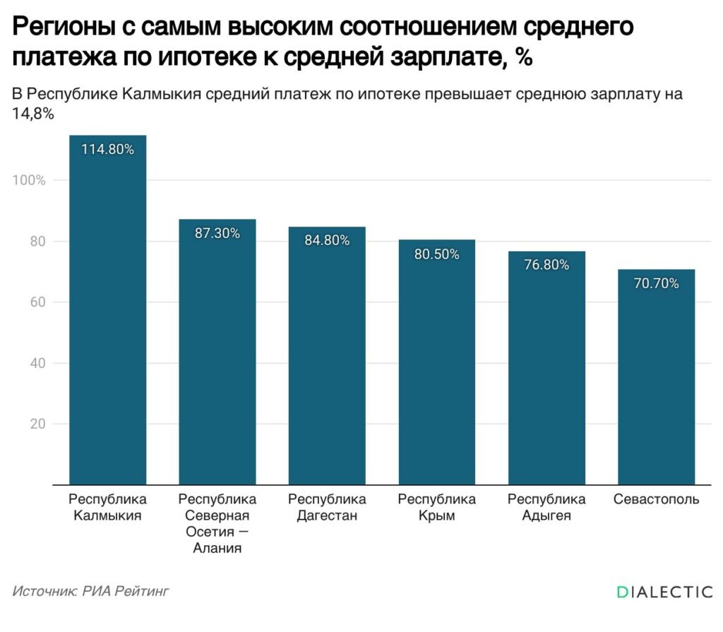 Средний ежемесячный платёж по ипотеке в России достиг отметки в 80 тысяч рублей, при этом в некоторых регионах эта сумма превышает средний уровень заработной платы. Об этом свидетельствуют результаты исследования РИА Рейтинг, опубликованного на сайте РИА Новости. Лидером по самому высокому соотношению ипотечного платежа к средней зарплате стала Республика Калмыкия, где этот показатель составил 114,8%. В этом регионе средний ежемесячный платёж по ипотеке достигает 105,9 тысяч рублей при кредите в 6 миллионов рублей. В число регионов с наиболее сложной доступностью ипотеки также вошли Северная Осетия — Алания, Дагестан, Крым, Адыгея и Севастополь. Эти цифры наглядно демонстрируют существенные региональные различия в финансовой нагрузке на домохозяйства. На противоположном конце рейтинга находятся субъекты с более благоприятной ситуацией, где ипотека доступнее. К ним относятся Ингушетия, Чечня, Алтай, Вологодская область, Кабардино-Балкария и Курганская область. В абсолютных показателях с