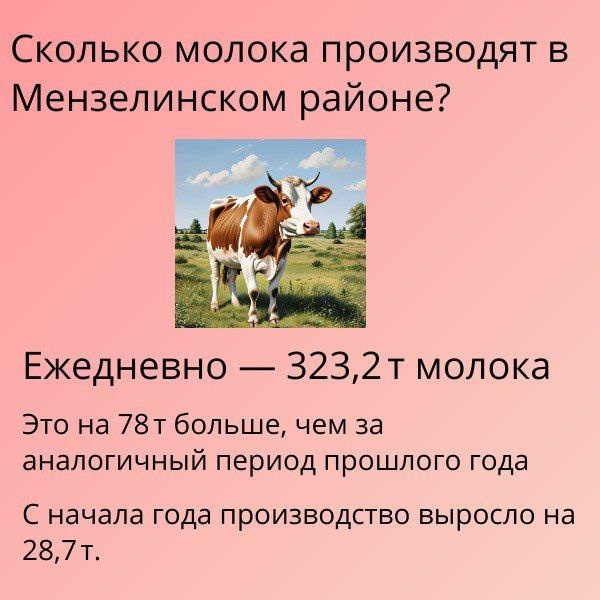 Мензелинские животноводы ежедневно надаивают 323,2 тонны молока, что на 78 тонн больше, чем за аналогичный период прошлого года. В среднем по району от каждой коровы получают по 28 килограммов молока.