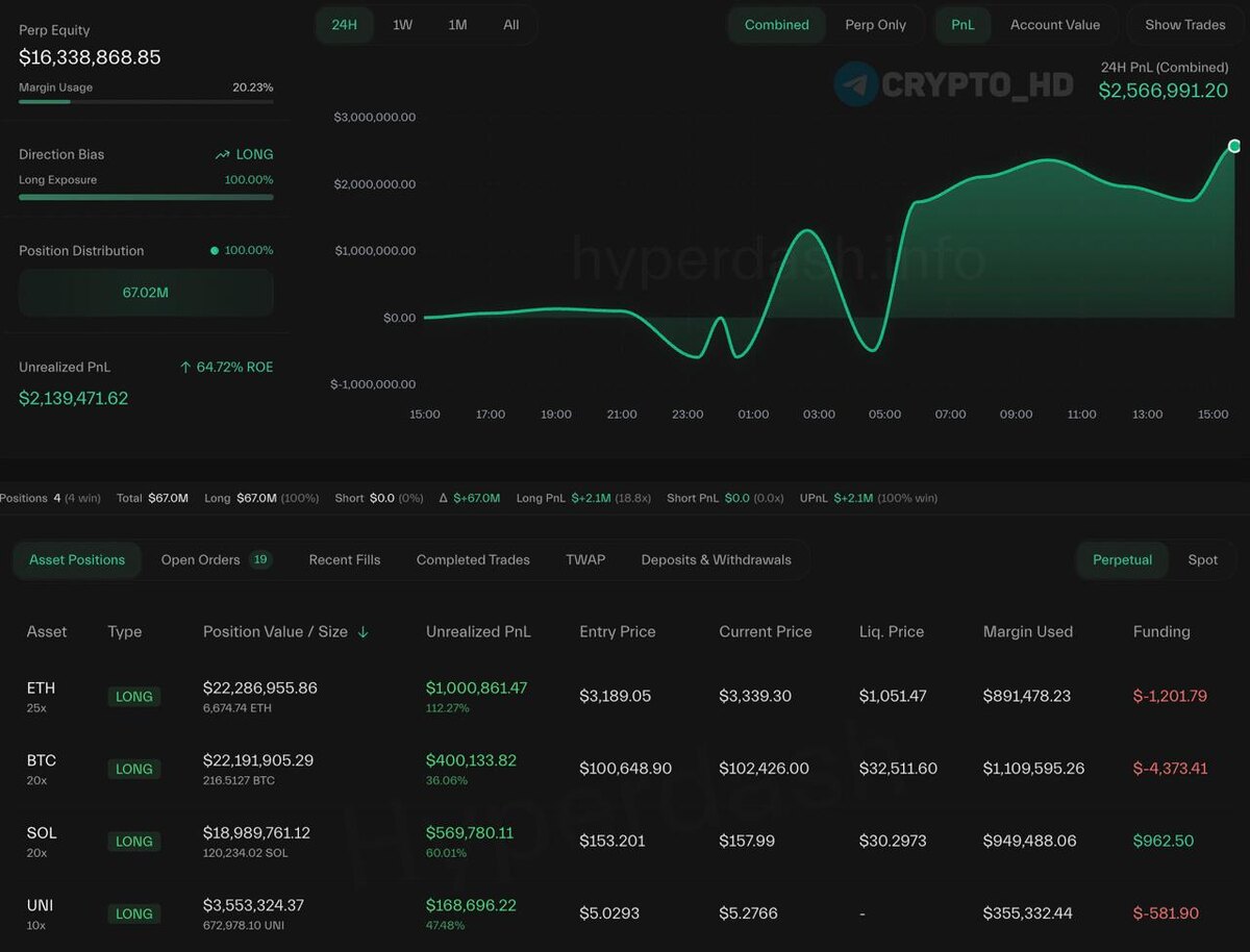 🍸 Находчивый трейдер «0x926» заработал $4,740,000 на своих шортах по #BTC и #SOL за последние 26 часов. Теперь этот кит залетел в лонги: ❖ LONG по #ETH с 25х плечом на $22,200,000+. Точка входа: $3189. Ликвидация: $1051. ❖ LONG по #BTC с 20х плечом на $22,100,000+. Точка входа: $100,648. Ликвидация: $32,511. ❖ LONG по #SOL с 20х плечом на $18,900,000+. Точка входа: $153.2. Ликвидация: $30.2. ❖ LONG по #UNI с 10х плечом на $3,500,000+. Точка входа: $5.02. Ликвидация: $5.27 Сейчас нереализованная прибыль инвестора превышает $2,100,000. Примечательно, что этот трейдер выиграл каждую сделку за последний месяц, заработав $20,600,000. Cryptо Headlines