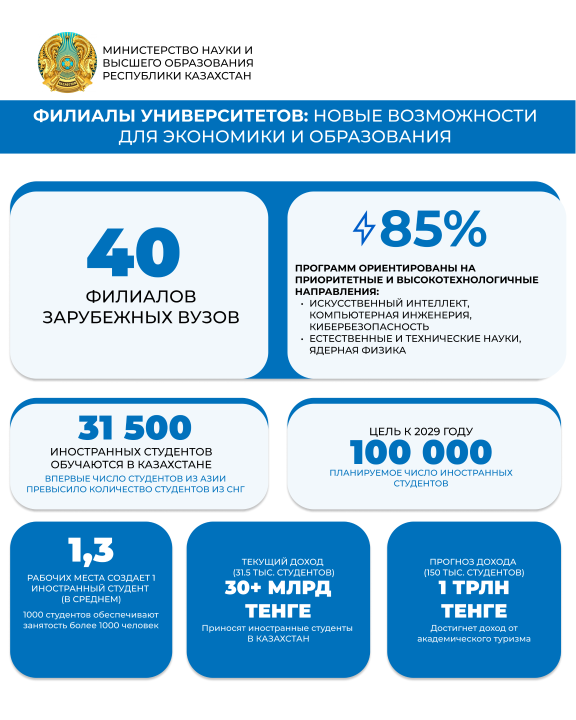 Первое. В Казахстане развивается сеть из 40 филиалов зарубежных университетов. 85% программ – по высокотехнологичным направлениям: ИИ, кибербезопасность, инженерия, естественные и технические науки. Второе. Филиалы способствуют развитию академического туризма. В Казахстане обучаются 31 500 иностранных студентов – это исторический рекорд. Реализуется кампания Study in Kazakhstan – выставки прошли в Великобритании, Азербайджане, Пакистане и Китае, в 2025-2026 годах состоятся в ряде азиатских и ближневосточных стран. Третье. Филиалы открываются с учетом потребностей регионов, внедряют современные стандарты. Четвертое. Повышаются качество и конкурентоспособность высшего образования. В рейтинге THE-2026 представлены пять казахстанских университетов. NU вошел в топ-500, впервые вошел Казахский национальный аграрно-исследовательский университет. Средние показатели вузов улучшились на 2,5 пункта. На подготовку кадров с высшим и послевузовским образованием выделено 98 000 грантов. Пятое. Повыше
