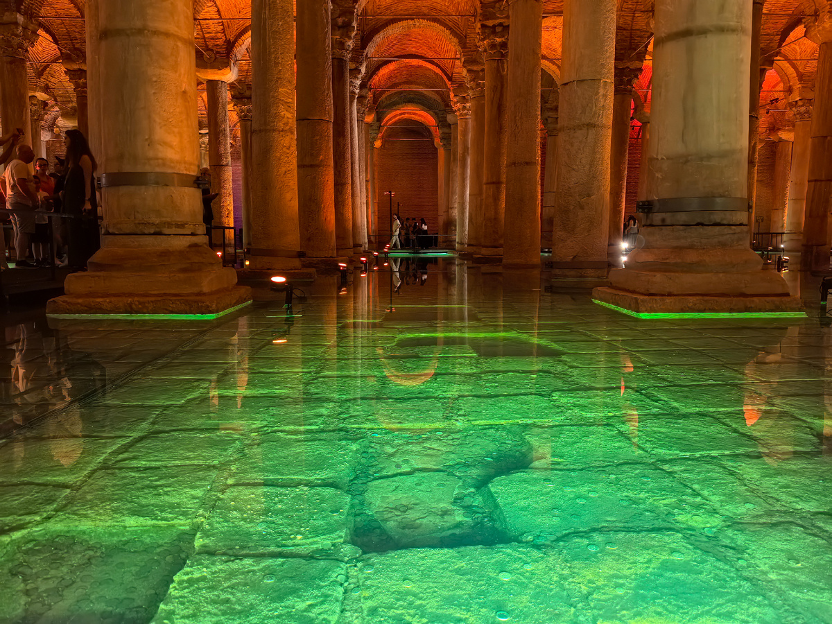 Еще одно место, которое стоит посетить в Стамбуле, - это Цистерны Базилика. Это подземное водохранилище Константинополя, сооружение которого велось более 200 лет, началось при правлении императора Константина и закончилось при правлении Юстиниана. Найти Цистерны Базилика легко: они располагаются через дорогу от Айя Софии. Сооружение выглядит как невзрачное одноэтажное здание. Вы, возможно, увидите и очередь из посетителей (по крайней мере нам пришлось немного простоять в ней). Небольшая очередь в Цистерны Базилика. Когда мы стояли, людей было в 5 раз больше. Фотография сделана почти в одинадцать утра среды, возможно, поэтому людей немного, пока немного. Кстати для информации, как сэкономить: в кассах при продаже билетов предлагают приобрести аудиогид, вот здесь рекомендую приобрести только один билет с аудиогидом, так как здесь будет вам дана ссылка с паролем из билета на подключение смартфона, и если звук на телефоне у вас громкий, то уверяю вас, вам хватит одного аудиогида. А ещё