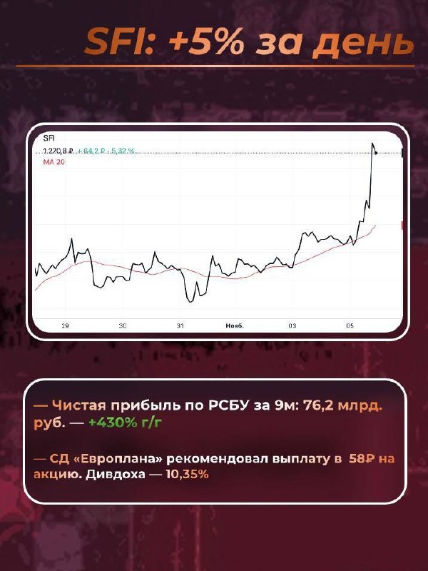 Что случилось с SFI? Сегодня наблюдаем локальную ракету в акциях компании. Разбираемся, в чем дело: — Компания опубликовала РСБУ за 9 месяцев, чистая прибыль составила 76,2 млрд руб. (+430% г/г). Основной эффект — прочие доходы. Компания решила переоценить Европлан по рыночной стоимости, хотя раньше оценивала по-другому. Интересно, в чем же причина такого решения? В интернете говорят, что по рыночной стоимости на балансе оцениваются те активы, которые планируется продавать. — СД Европлана сегодня рекомендовал дивиденды в 58 рублей на акцию с доходностью около 10%. ВОСА пройдет 4-го декабря. Скоро на нашем канале выйдет ролик с IR директором SFI. Ждите топ контент! @harmful_investor