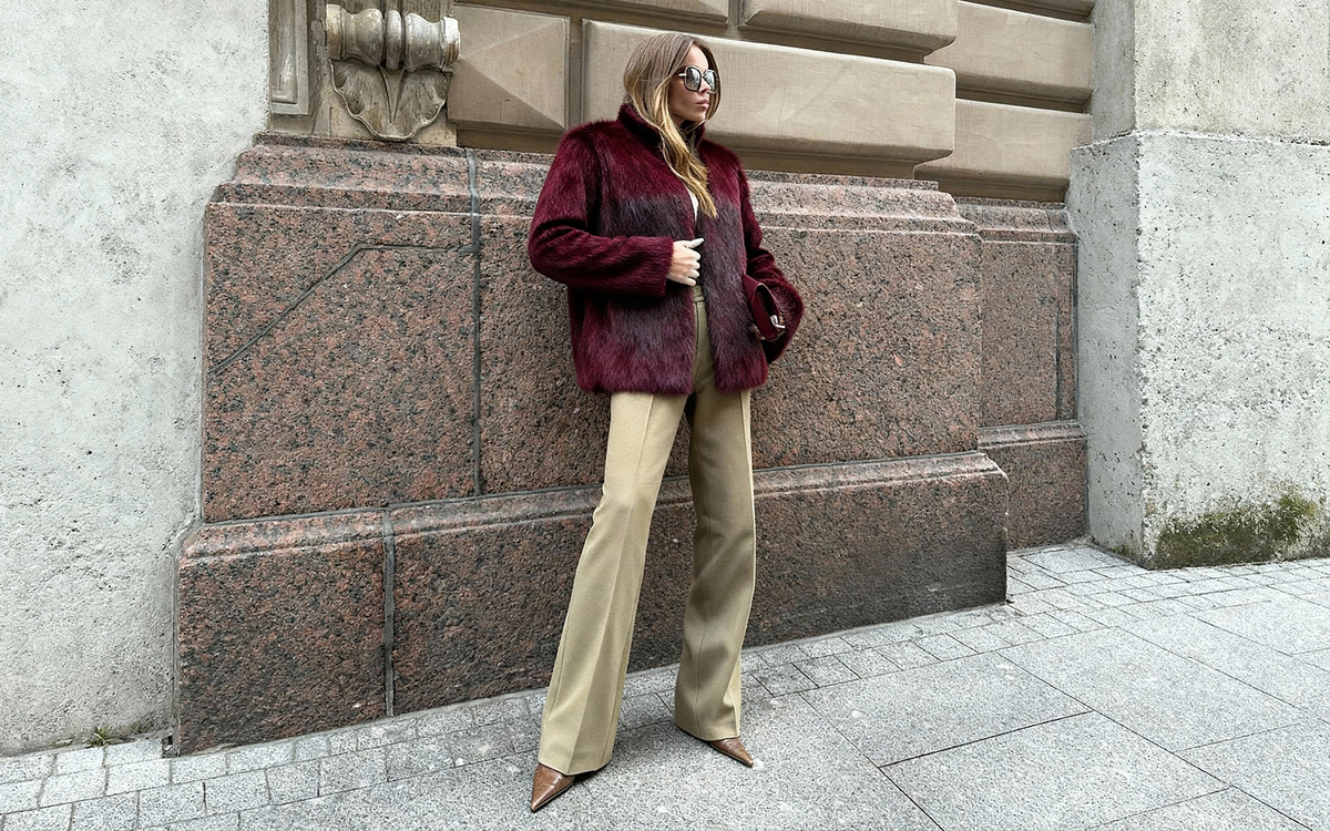 необходимостью, а важным стилевым акцентом. Гладкий бордовый полушубок Patrizia Pepe придаст вечернему образу гламурное звучание и кокетство, прекрасно сочетаясь с платьем-миди и изящными сапогами ботфортами.