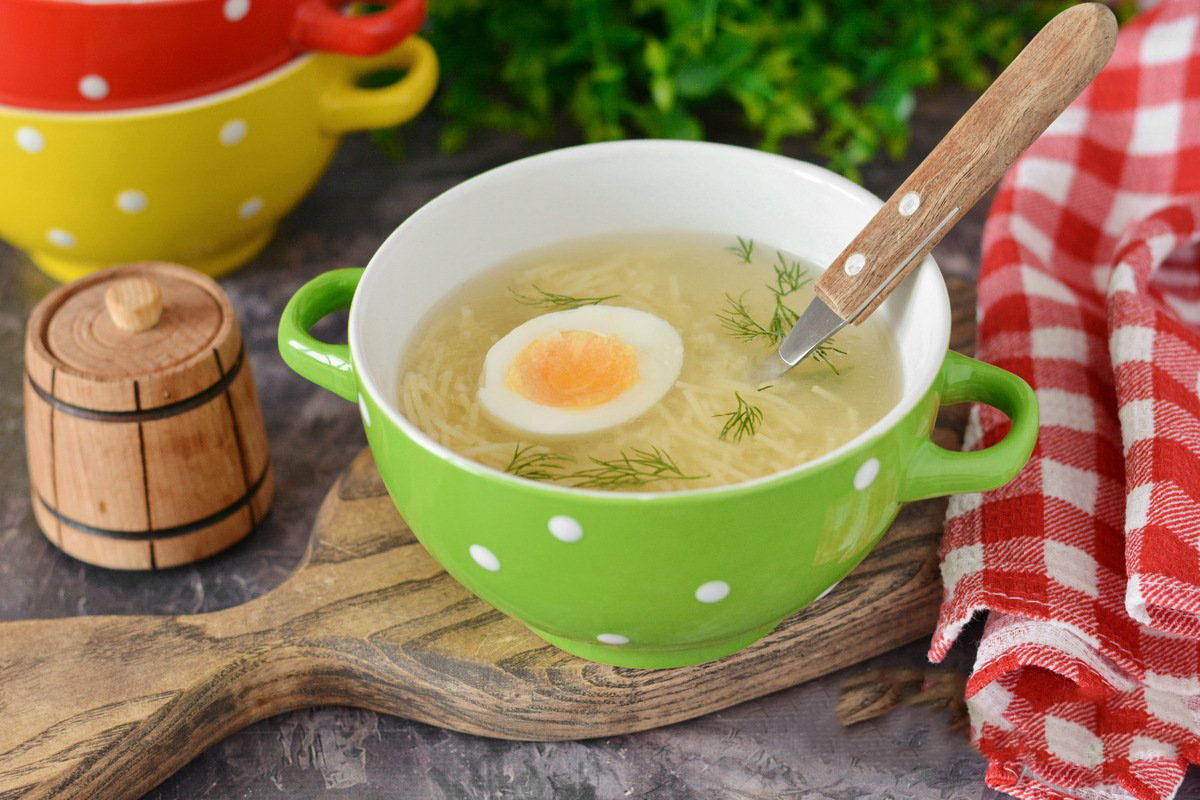 Самое простое первое блюдо - это куриный бульон с вермишелью-паутинкой и половинкой варёного яйца!