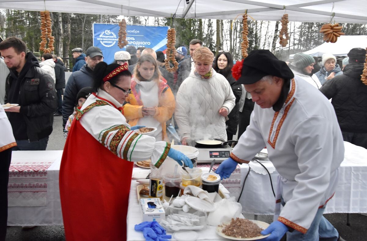 В шатре санатория-профилактория «Ковдорский» гостей ждали традиционные русские яства: горячий чай, сбитень с киселем, свежеиспеченные блины, каша с грибами и разнообразная выпечка.