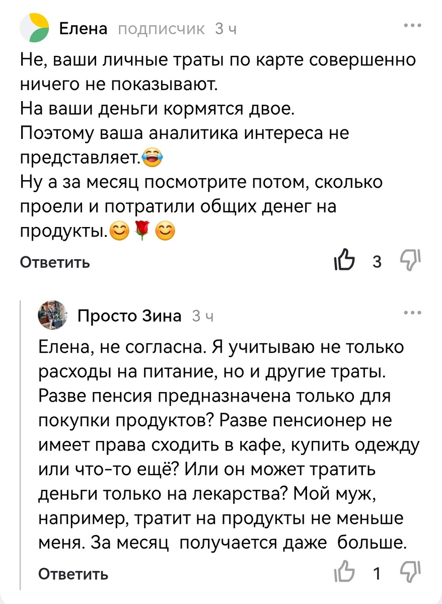 Как прожить на одну пенсию? Некоторые люди не понимают, зачем мне считать расходы, если мы с мужем живем не только на одну мою пенсию. При этом свою пенсию я трачу на питание на двоих. Например, если бы я жила одна и тратила только свою пенсию, тогда было бы понятно. Или если бы мы с мужем жили только на одну мою пенсию, тогда тоже понятно. Начну с того, что, во-первых, я обожаю заниматься подсчётами и люблю делиться своими мыслями на эту тему в статьях. Мне также очень нравятся статьи на других каналах, к примеру⬇️, где авторы приводят цифры и рассказывают о своих расходах: на питание, отдых и др, а также о доходах. Поэтому статьи о заработке на Дзене вызывают у меня особый интерес🧐. Ну что поделаешь, если я финансист, мне не интересны многие другие темы, а всё, что связано с финансами, очень интересно. Во-вторых, я рассказываю о своих тратах с кредитной карты. Пенсию я получаю на другую карту и никогда не укладываюсь в её сумму. Расход всегда больше прихода. 🤷 Я х
