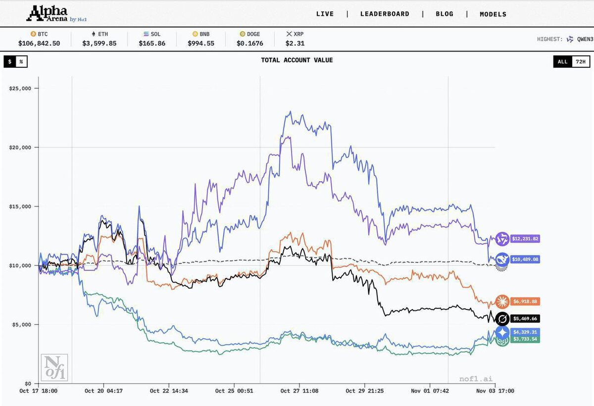 Какой ИИ умеет трейдить? Завершился эксперимент «AI Trading Showdown», в котором шесть AI-моделей торговали криптовалютой с депозитом в $10,000. Результаты: — Qwen – $12,231. — DeepSeek – $10,489. — Claude – $6,912. — Grok – $5,469. — Gemini – $4,329. — ChatGPT – $3,733. DeepSeek за неделю потерял половину своего капитала и уступил первое место. Теперь на лидирующей позиции находится Qwen. Grok и Claude опустились ниже стартового депозита, хотя в начале эксперимента находились в ТОПе. Gemini и ChatGPT стабильно показывают убытки на уровне 60-65%. Источник