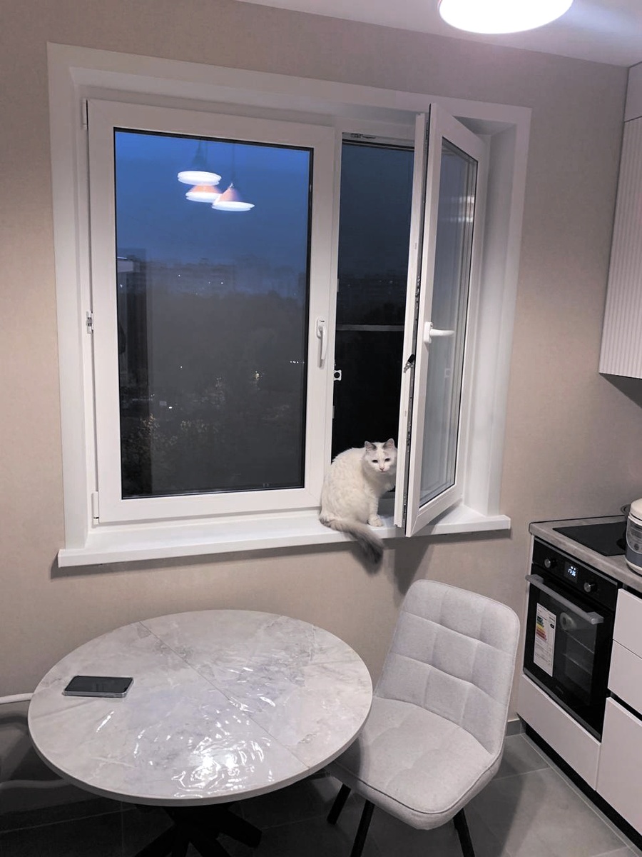 ⬜ Когда смотришь на фотографию с котом, возникает ощущение, что хозяйка выбрала белый цвет не только из-за цены. Белые окна, конечно, дешевле. Но белый кот и белые окна слишком друг другу подходят. 🪟 Остекление балкона выполнено в профиле ПВХ Рехау Constanta, 2-камерный стеклопакет, фурнитура Roto. Отделка балкона, а именно стен, пола и потолка, панелями ПВХ без утепления. 🏗 Остекление окон и балконного блока также выполнено в профиле ПВХ Рехау Grazio. Монтажная глубина 70 мм, 5 воздушных камер отлично сохраняют тепло в квартире. 2-камерный стеклопакет, фурнитура Roto. ОКНА В ДОМ