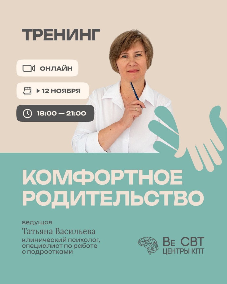 📣 Спешим сообщить, что онлайн-тренинг "Комфортное родительство" переносится на 12 ноября. На тренинге вы узнаете о том, как найти общий язык с подростком, научиться восстанавливать свое эмоциональное состояние и начать получать удовольствие от роли родителя. Тренинг будет полезен для вас, если: 💚Не получается выстроить доверительные отношения; 💚Ребенок хлопает дверью и огрызается; 💚Чувствуете гнев, вину, печаль, тревогу, обиду; 💚Хотите уберечь ребенка от ошибок, но вас не слышат; 💚Разговоры часто заканчиваются ссорами; 💚Устали быть родителем; 📌Программа тренинга: 🟢Что происходит с моим ребенком? Особенности возраста. Теория. 🟢Болезненные эмоции. Как справляться с гневом, раздражением и обидой. Техники эмоциональной регуляции. Теория и практика. 🟢Поддержать или запретить? Правила конструктивной обратной связи. Теория. 🟢Что такое ошибки мышления и как они влияют на эмоциональное состояние и общение с ребенком. Теория. 🟢Родительское выгорание. Как восстанавливать свои ре