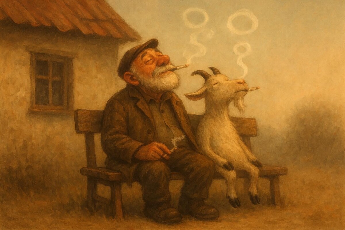 Что ж, перед нами не просто история, а настоящая притча из степей, где пыль дорог смешивается с дымом махорки. Посему, слушайте, да не смейтесь слишком громко, чтобы не спугнуть духов чудачеств минувших дней. В селе, где аисты в гнёздах вили сплетни о жителях, а куры были главными новостными обозревателями, жил-был старик Ефим. Главным сокровищем его был рогатый компаньон, козёл по прозвищу Сивохар. Ефим дымил вдумчиво, как философ, уверенный, что лучшие мысли рождаются в клубах ароматного дыма. В его руке папироса становилась кистью, а воздух холстом. Но творить в одиночестве скучно. И однажды, взирая на умные, желтые глаза Сивохара, Ефима осенило: «А почему бы не приобщить к высокому искусству и это бородатое создание?» Сивохар же, был козёл не промах, сразу понял, дело пахнет чем-то куда более интересным, чем полынь. И пошла у них наука. С терпением и ломтем сахара. Ефим, как истинный гуру, учил Сивохара дымить с каким-то неземным, козлиным шармом. И вот картина, которую застала юн