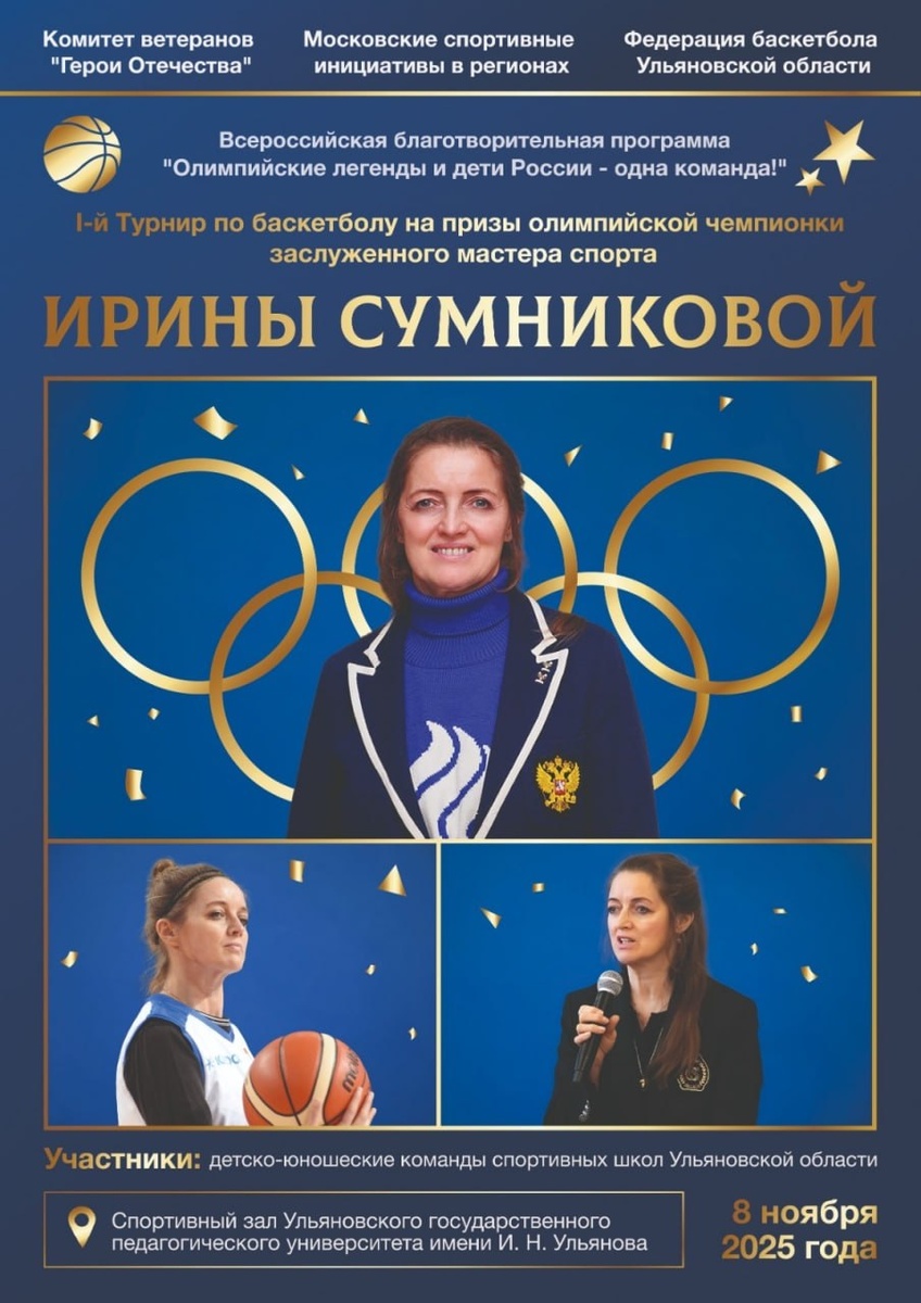 В Ульяновске пройдет первый турнир по баскетболу на призы Олимпийской чемпионки На базе УлГПУ им. И.Н. Ульянова 8 ноября пройдёт первый турнир по баскетболу на призы Олимпийской чемпионки, Заслуженного мастера спорта Ирины Сумниковой Расписание: 8.45 - 9.30 - «Олимп» - Ишеевский МПЛ (Дев.) 9.35 - 10.20 - «Симбирские Орлы» - «Данко» (Юн.) 10.25 - 11.10 - «Цементник»- «Олимп» (Дев.) 11.15 - 12.00 - «Данко» - «Старт» (Юн.) 12.05 - 12.50 - «Олимп» - Ишеевский МПЛ (Дев.) 12.55 - 13.40 - «Старт» - «Симбирские Орлы» (Юн.) А с 11:00 до 11:30 пройдет автограф сессия Прямые трансляции пройдут в группе Федерация баскетбола Ульяновской области Подписаться на наши новости