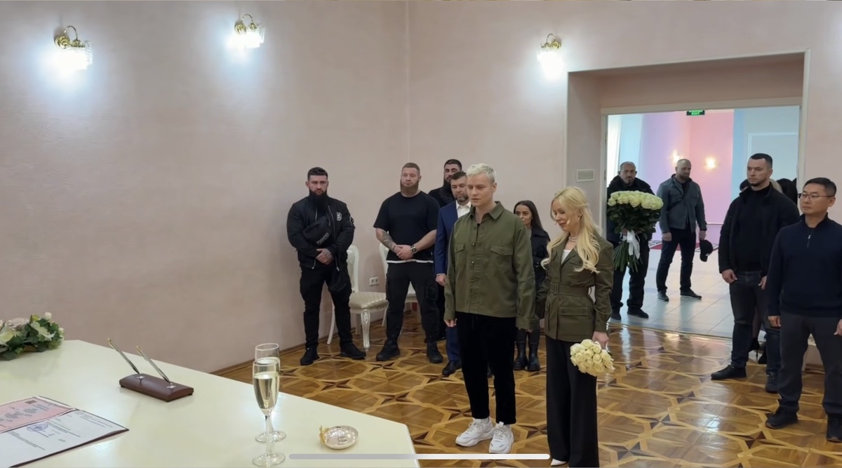 Честно: картинка продумана. Локация задаёт тон : в это городе было бы странно играть в «дворцовый» китч и многометровые шлейфы. Пара выбрала язык униформы: утилитарный верх (милитари/гимнастёрка), строгий чёрный низ и минимум декора. Это не история про моду ради моды, здесь важнее сообщение: «официально вместе» в максимально сдержанном регистре. Плюс логистика: короткая церемония, минимум гостей, нейтральные фактуры. По кадрам с места видно: всё уложилось в несколько минут, без красочного «шоу».