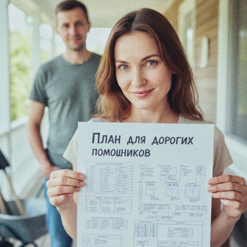Положила трубку, посмотрела на ватман, и прикрепила его к стене веранды, на самом видном месте, прямо напротив входа. «ПЛАН ДЛЯ ДОРОГИХ ПОМОЩНИКОВ».