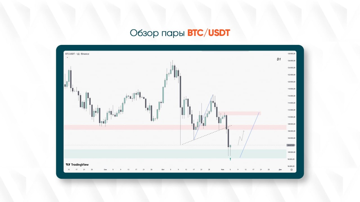 На дневном графике BTC/USDT видно, что цена протестировала область поддержки вблизи $100 000 и отреагировала небольшим отскоком. Эта зона выступает ключевым психологическим и техническим уровнем — в прошлом здесь уже появлялись активные покупатели.