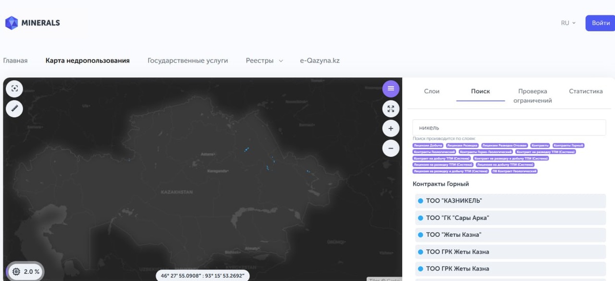 Что творит Казахстан. Делаю исследование по никелю и кобальту. А они сайт обновили и прямо на сайте без кодов и СМС Карта недропользования с обозначением добычи полезных ископаемых.