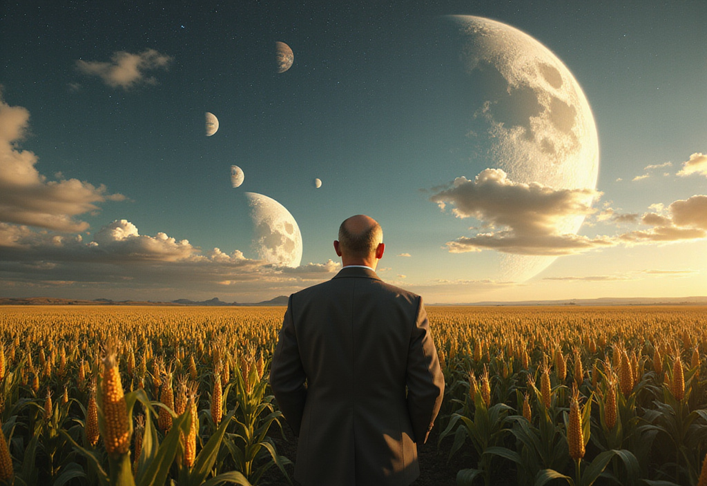 *** **Зерно Грядущего** Агрономическая экспедиция в высохшей степи под Целиноградом затянулась до позднего вечера. Никита Сергеевич Хрущёв, сняв пиджак и отдав его заботливо стоявшему адъютанту, сам вёл машину по ухабистой полевой дороге. Его одолевало странное, ни на чём не основанное беспокойство. Отчётность была хорошей, урожайность — приемлемой, но ему, как человеку, видевшему голод вживую, этого было мало. Приемлемо — не значит победа. Внезапно мотор заглох. Все попытки завестись снова были тщетны. Пока шофер и механик копались под капотом, Хрущёв, махнув рукой на уговоры охраны остаться, пошёл прочь от пыльной дороги, в сторону бескрайнего поля, подпираемого багровым закатным небом. Он шёл, разминая ноги, и вдруг его взгляд упал на нечто необычное. Среди низкорослой, выжженной солнцем пшеницы одиноко стоял один-единственный стебель. Но какой! Он был почти в два раза выше него самого, мощный, тёмно-зелёный, с широкими, как лопасти, листьями, которые отливали в сумерках слабым фос