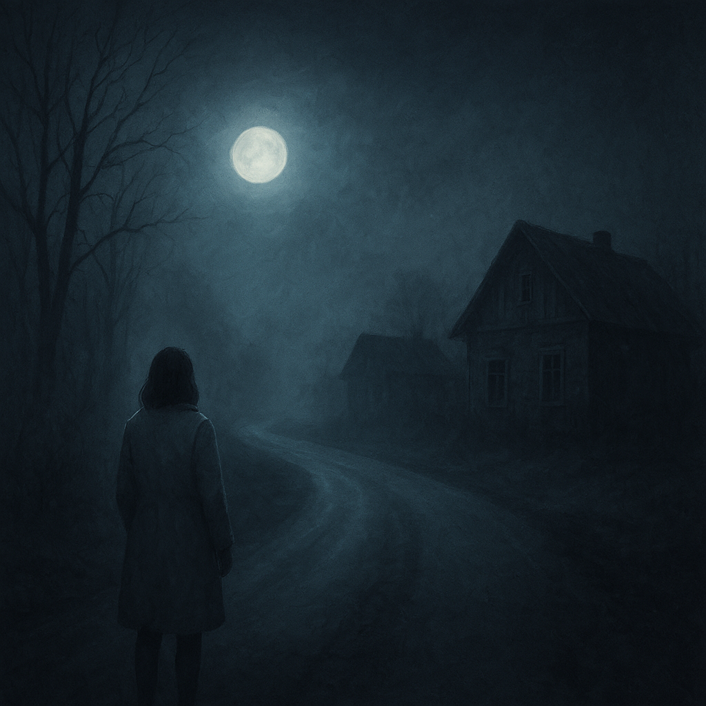 Еду. Дорога узкая, но асфальт свежий, светло, будто недавно каток прошёл. Ни одной машины, ни огней.Через десять километров вижу деревню. Все дома одинаковые, серые, без света. Только один — с горящим окном.