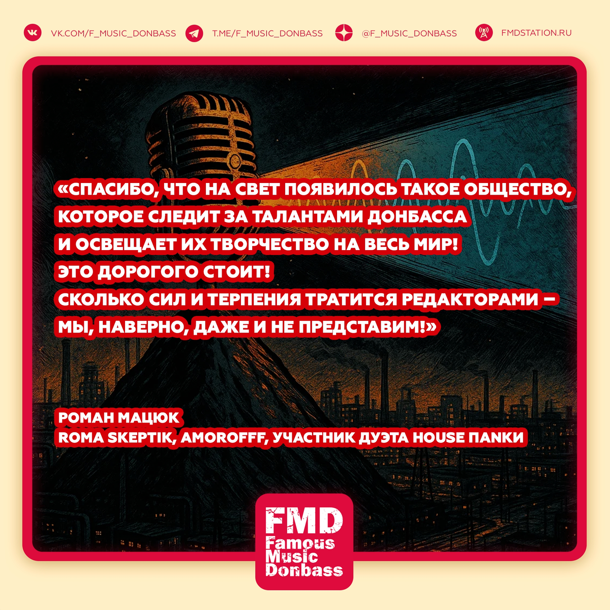 Редакторы FMD привыкли опрашивать музыкантов и продюсеров о новых релизах Донбасса. Но в этот раз мы спросили — о себе. Нам важно было услышать, как работа паблика — чарты, радио, рецензии, афиши — влияет на вас, артистов.