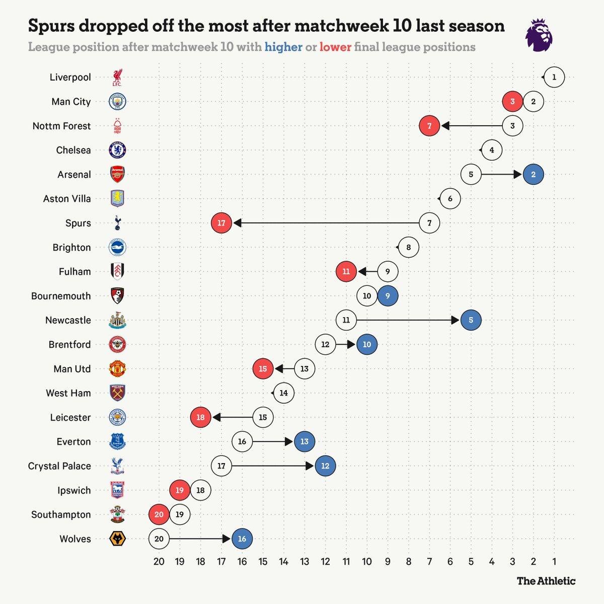 Позади только 10 туров, но исторические данные показывают, что на 77% итоговая таблица сезона Премьер-Лиги сформирована уже к 10-му туру (на фото пример из прошлого сезона) 📊