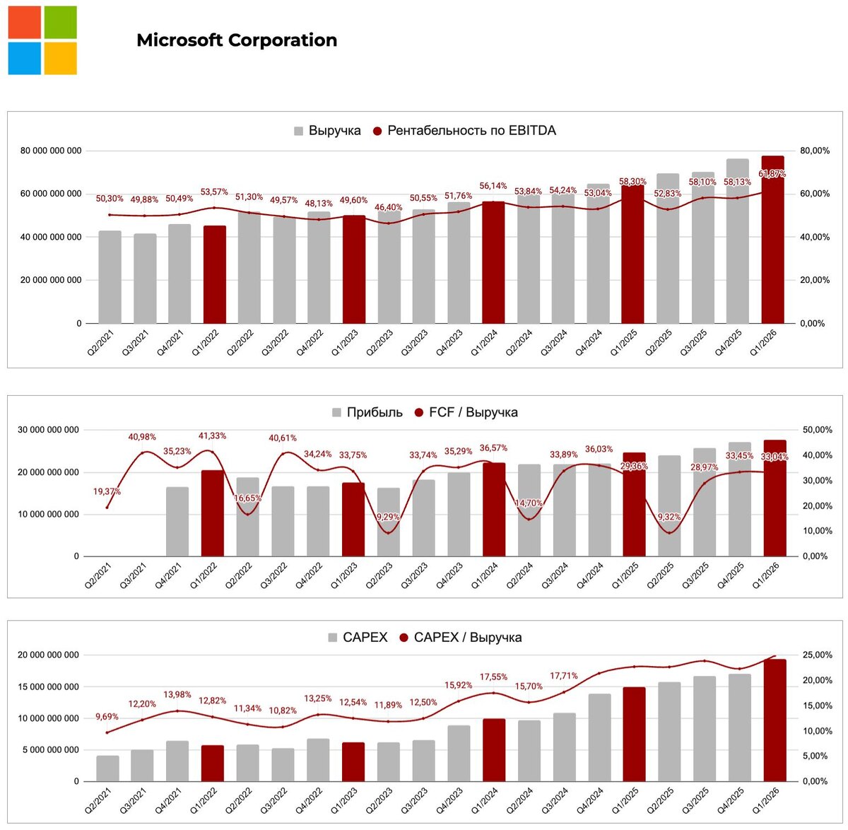 Капитальные затраты Microsoft достигли $34,9 млрд за квартал, половина из которых ушла на GPU и CPU.