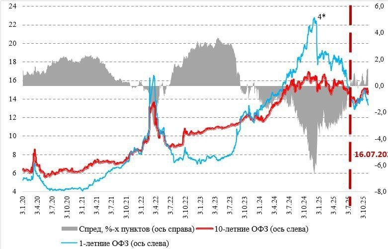 ⚡️На рынке ОФЗ складывается аномальная ситуация. Красная линия — долгосрочные гос. облигации, а голубая — краткосрочные. Обычно долгосрочные займы имеют более высокий процент. Однако в середине года ставки сравнялись, а сейчас краткосрочные ОФЗ даже более доходны. 🚨Это явление называется инверсия кривой. И оно практически всегда предшествует кризисам. Рынок предчувствует негативные изменения в экономике как лягушки чуют непогоду. Выводы делайте сами. #экономика