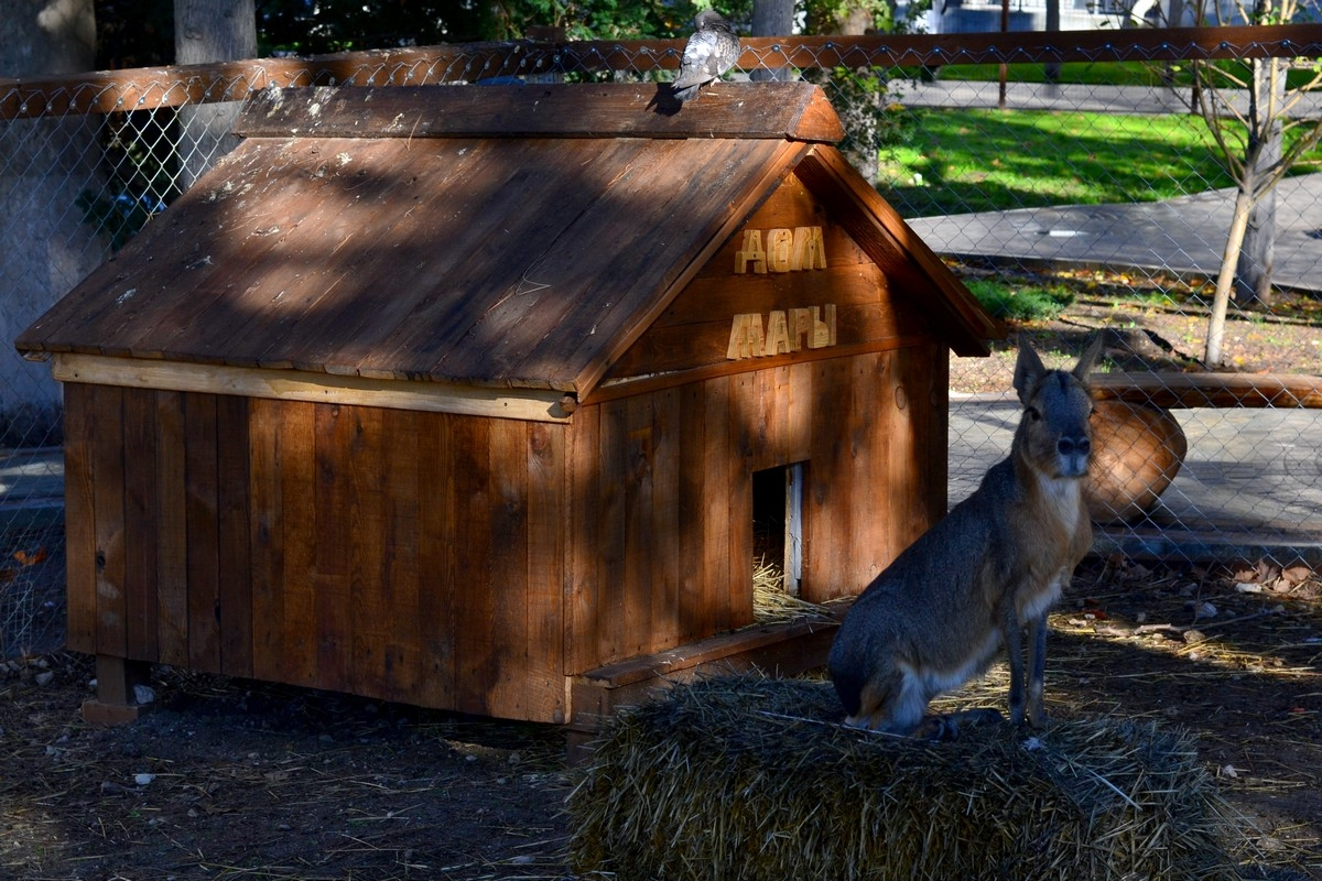 Это мара - патагонский заяц из Южной Америки, то есть природно обитает в Аргентине и Чили. Есть ещё разновидность - чакоанская мара - обитают в штате Нью-Мексико в США, это уже будут братья и сёстры патагонских ушастых из Северной Америки. Впервые в Крыму вижу такое чудо, как я ранее писал, их двое, семейная парочка, детишек пока нет. По внешнему виду, как мне, это какой-то гибрид кенгуру и обычных зайцев. :) Симпатяги.