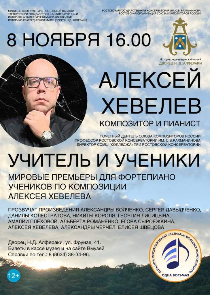 8 ноября в двусветном зале Дворца Алфераки Таганрога пройдет историко-музыкальный вечер «Учитель и ученики». Для любителей фортепианной музыки выступит почётный деятель и председатель Ростовской областной организации Союза композиторов России, профессор Ростовской государственной консерватории им. С.В. Рахманинова, лауреат всероссийских и международных конкурсов Алексей Хевелев. В рамках Восьмого международного фестиваля молодых композиторов «Одна восьмая» Алексей Хевелев исполнит собственные сочинения и произведения своих талантливых учеников: Александры Волченко, Сергея Давыдченко, Данилы Колестратова, Никиты Короля, Георгия Лисицына, Амалии Плеховой, Альберта Романенко, Егора Сыроежкина, Александры Черчел, Елисея Швецова. Концерт начнется в 16.00 в здании Историко-краеведческого музея на улице Фрунзе, 41. Справки по телефону: 8(8634) 38-34-96. Ранее мы рассказали, что творчество Есенина и Чехова стали главными темами «Ночи искусств» в Таганроге. Фото Владимира Прозоровского