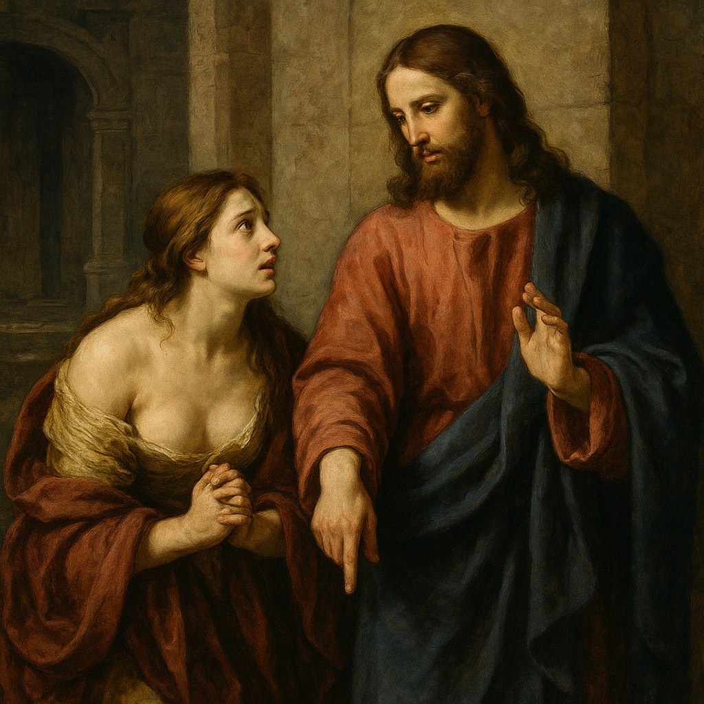 Согласно Евангелию от Иоанна (Ин. 8:1-11), у подножия Храма в Иерусалиме фарисеи и книжники привели к Иисусу женщину, уличённую в прелюбодеянии. По закону Моисея за подобное преступление следовало побить камнями до смерти. Они спросили Иисуса: «Что скажешь Ты?» — надеясь поймать Его на противоречии закону. В ответ Иисус склонился к земле и начал писать пальцем на песке. Когда Его продолжали спрашивать, Он произнёс знаменитую фразу: «Кто из вас без греха, пусть первым бросит в неё камень»(Ин. 8:7). Тогда обвинители, начиная со старших, один за другим уходили, осознав свою несостоятельность судить. Осталась только Иисус и женщина. Он сказал ей: «И Я не осуждаю тебя; иди и впредь не греши». Христос знал, что пришёл в мир не для того, чтобы судить, а чтобы спасти. Он показал, что милосердие важнее слепого следования букве закона. Эта история учит нас не торопиться судить других, видеть свои собственные несовершенства и протягивать руку помощи тем, кто оступился. Сегодня, когда вокруг мног