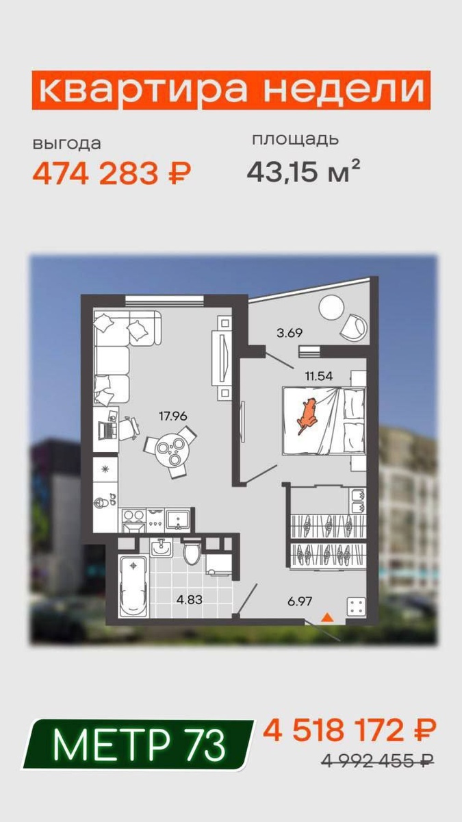 Квартира недели от ЖЕЛЕЗНО ❤️🔥 Успейте забронировать до 12 ноября 2025 года Евро 2 комнатная квартира в ЖК «Ultragrad» - просторный санузел 5 м², - кухня-гостиная 18 м², - спальная комната с лоджией и гардеробом, - базовая отделка, 🎁 кладовка площадью 4,37 м² в подарок (3 секция дома) 🌟Площадь: 43.15 м² 🌟Дом: №1 | Этаж: 2 | Квартира: №134 🌟Срок сдачи дома: декабрь 2025 года Полная стоимость: 4 992 455,00 руб. Стоимость с выгодой: 4 518 172 руб. ✔️При быстром выходе на сделку — скидка 9,5%! ➡️Это значит, что вы сэкономите 474 283 руб.