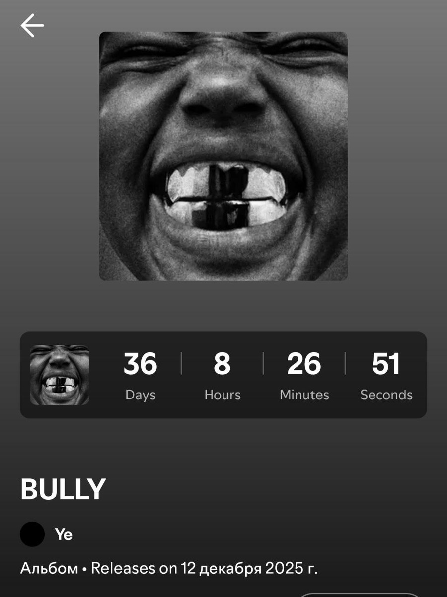 В ответ на пост ‼️ KANYE WEST СНОВА ПЕРЕНЁС «BULLY»! Йе снова изменил дату релиза долгожданного альбома — теперь с 7 ноября на 12 декабря (опять) Это уже шестой перенос. ❤️🔥 / 👎 💀 FML MATTERS