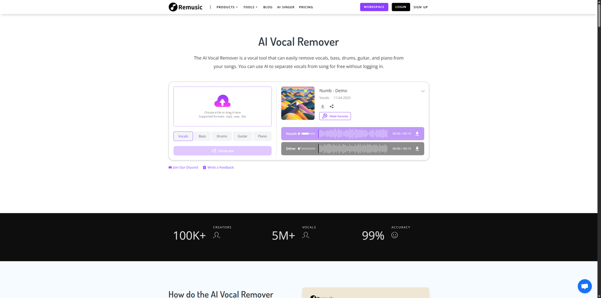 Remusic AI Vocal Remover — это онлайн-сервис, который позволяет удалить вокал или выделить отдельные инструменты из любой песни буквально за несколько секунд. Работает прямо в браузере, без установки программ и без регистрации. Remusic использует искусственный интеллект для анализа трека и разделения его на аудиодорожки: * Вокал * Басы * Гитара * Барабаны * Клавишные и другие инструменты После обработки можно отключить ненужные дорожки — например, убрать голос и оставить только инструментал, или наоборот, выделить вокал отдельно. * Поддержка популярных форматов: MP3, WAV, FLAC и других. * Полностью онлайн-обработка — никаких установок и сложных настроек. * Возможность выбора, какие инструменты оставить. * Высокая скорость работы — результат готов за несколько секунд. * Бесплатное использование, без скрытых ограничений. * Простота — загрузил трек, нажал кнопку и получил чистую мелодию. * Гибкость — можно удалить вокал, бас или гитару по отдельности. * Подходит всем — диджеям, музыкантам