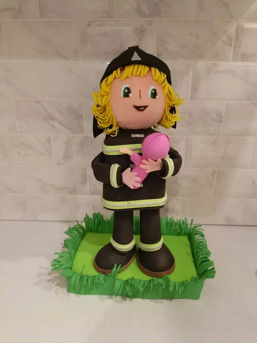 А это второй наш персонаж- пожарный, который спас малыша , тоже поделка к детскому конкурсу. Но победили мы только на районном этапе . Но мальчишки были очень рады . По оформлению и материалам для его создания в точности всё как и у футболиста (ранее о нём писала ) .