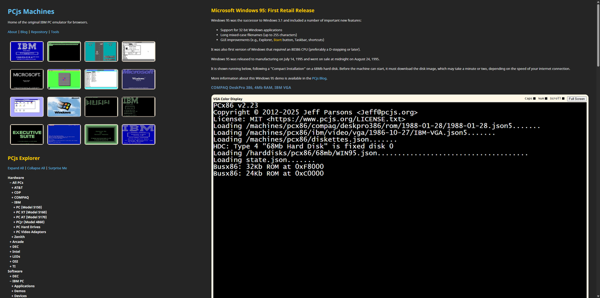 Энтузиасты перенесли полноценную эмуляцию Windows 95 в браузер. Теперь операционную систему можно запустить и использовать без установки, прямо из окна поисковика. Проект основан на технологии PCjs — это эмулятор IBM-совместимых компьютеров, полностью написанный на JavaScript. Он воспроизводит работу старого ПК, включая BIOS, процессор, контроллеры и видеосистему, позволяя увидеть оригинальную Windows 95 в действии. Возможности эмуляции * Полноценный функционал: Windows 95 загружается в рабочем состоянии, с меню «Пуск», панелью задач и классическим интерфейсом. * Поддержка ПО: можно подгружать виртуальные дискеты и образы с программами, запускать старые приложения и игры. * Сохранение состояния: эмулятор позволяет зафиксировать текущее состояние системы, чтобы вернуться к нему позже. * Работа без установки: всё происходит онлайн — не требуется установка, настройка виртуальной машины или ISO-образа. Что важно знать * Работает медленнее реальной системы: всё эмулируется средствами JavaS