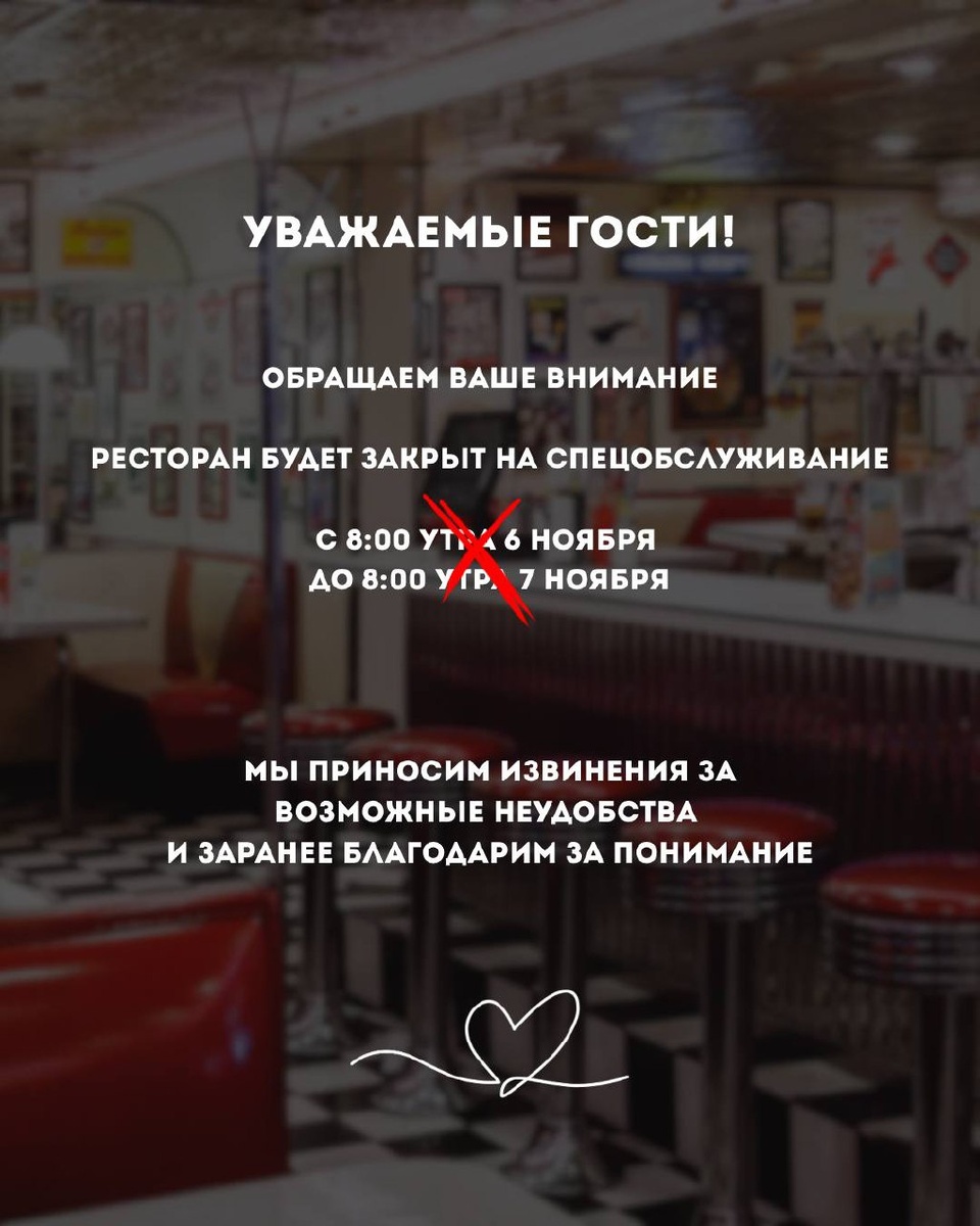 Уважаемые гости! Обращаем ваше внимание, что произошли небольшие изменения в графике работы ресторана STATLITE DINER. Ранее сообщенная дата закрытия на спецобслуживание с 6 на 7 ноября перенесена. Теперь ресторан будет закрыт с 8:00 утра 12 ноября до 8:00 утра 13 ноября на спецобслуживание. Просим прощения за возможные неудобства и благодарим за ваше понимание!