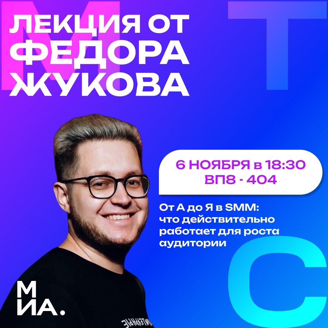 🏖️ Надеемся, ты хорошо отдохнул и готов продолжить занятия на Школе Медиа! Настало время разобрать SMM от А до Я! Вместе с Федором Жуковым — руководителем направления SMM в МТС Ads, обсудим, как создавать вирусный контент и привлекать настоящую аудиторию Не забудь время и место встречи: 🗓 6 ноября в 18:30 📍 РГСУ, ул. Вильгельма Пика, д.4, стр.8, ауд. 404 📎 Подписаться на МИА