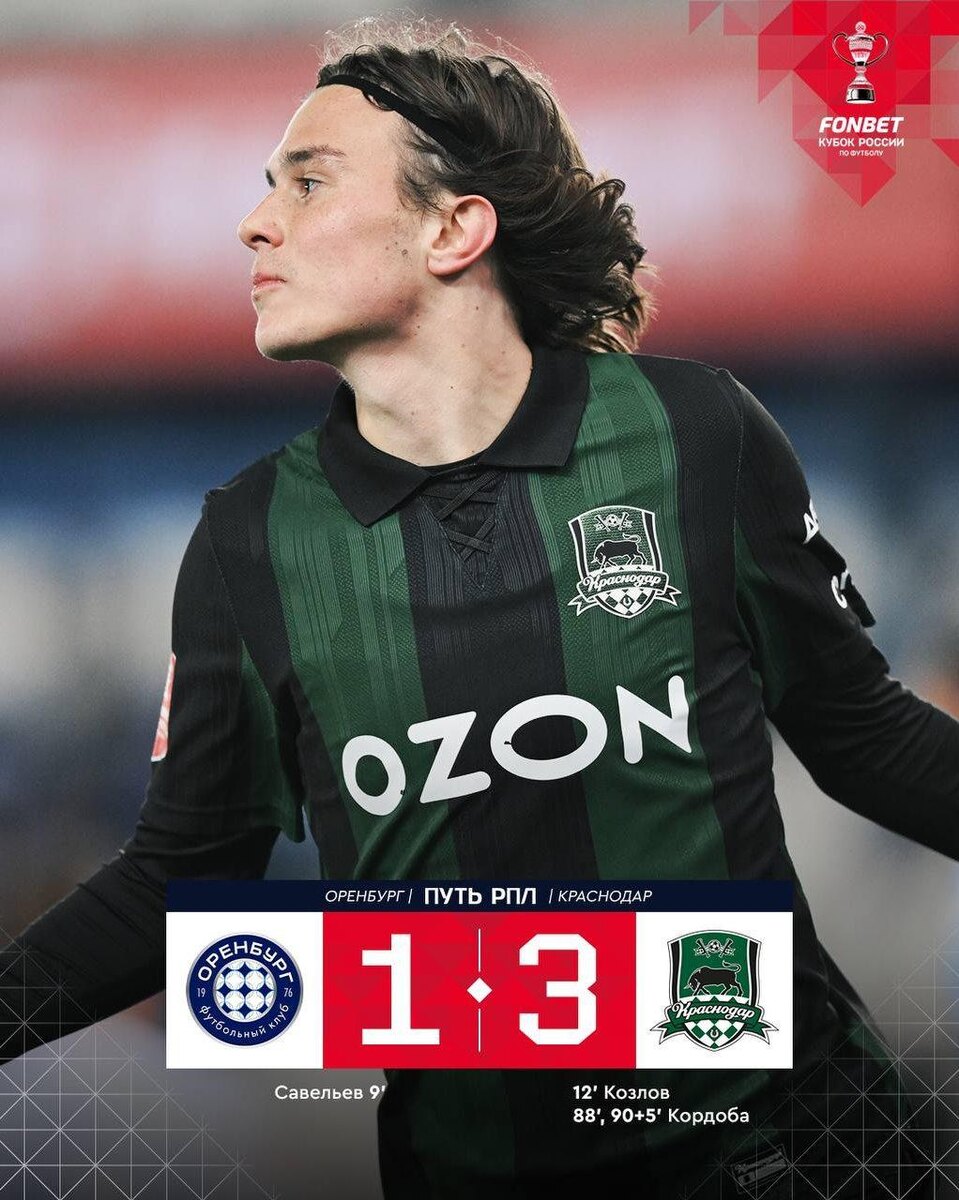 🔥🔥🔥 Кордоба и Козлов — это сила! 💚 💙 «Краснодар» одержал волевую победу над «Оренбургом» в первом матче четвертьфинала Пути РПЛ Кубка России. Оренбуржцы открыли счёт уже на девятой минуте — отличился Максим Савельев. Всего три минуты спустя Данила Козлов забил ответный мяч, и цифры 1:1 оставались на табло практически до конца основного времени матча. При этом на второй тайм в составе «быков» вышел на поле нападающий Джон Кордоба, и именно он в итоге стал одним из главных героев встречи. На 88-й минуте он вывел «Краснодар» вперёд, а на 95-й — поставил точку в матче. При этом нельзя не отметить Козлова, который, помимо гола, записал себе в актив две голевые передачи — именно он оба раза ассистировал Кордобе. Таким образом, чемпионы страны имеют хороший гандикап перед ответной встречей, которую они, к тому же, проведут на своём поле. @russian_rt_sport