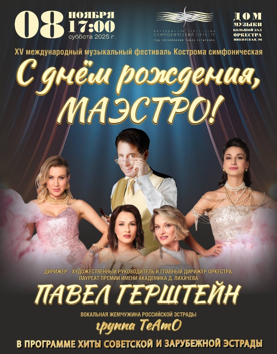8 ноября в Доме музыки состоится грандиозный концерт-посвящение: у бессменного руководителя Костромского губернского симфонического оркестра день рождения, который он отпразднует со звездными гостями и любимыми зрителями. Концерт «С Днем рождения, маэстро!» — торжество, куда приглашаются все без исключения. Это праздник, на котором главные сюрпризы ждут не именинника, а гостей. Виновник торжества подарит вам красоту и грацию, возведенные в четвертую степень, самые нежные и чувственные песни на свете и бескрайнее море любви… Это будет большой эстрадный концерт от Костромского губернского симфонического оркестра и женского вокального квартета «TeAmo». «Te amo» — на испанском, на итальянском — «ti amo», «Je t’aime» — на французском. Все это по-русски — «я тебя люблю». В четырех красавиц, однажды создавших в Москве коллектив с таким названием, действительно, невозможно не влюбиться. Все они – выпускницы одного курса Академии хорового искусства имени В. С. Попова, еще в студенческие годы об