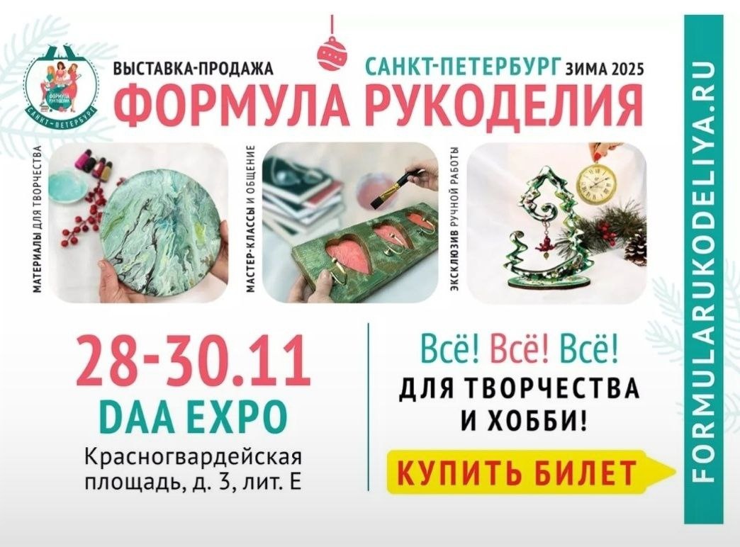 ВЫСТАВКА «Формула Рукоделия. Санкт-Петербург» На выставке представлены материалы и инструменты для различных видов рукоделия, наборы для творчества, а также авторские изделия ручной работы, книги, посвященные рукоделию. На одной площадке соберутся более 200 компаний-участников, от крупных производителей и издательств до частных мастеров. Гостей ждут творческие встречи, мастер-классы, красочные фотозоны и другие активности. «Формула Рукоделия – это праздник для тех, кто любит творчество и живое общение, запасается вдохновением и уникальными подарками. Репортаж с прошлогодней Формулы можно посмотреть по ссылке. 📍Выставочная площадка Design District DAA, DAA EXPO, Красногвардейская площадь, 3 лит. Е 🚇Новочеркасская 🕝28-29 ноября 2025 11:00-20:00 30 ноября 2025 11:00 -17:00 💸Стоимость: от 100 до 250 руб. 🔥30 ноября 2025 с 11:00 до 16:30 вход свободный! #s4you_выставки 🤍Spb4You. КУДА СХОДИТЬ?! 〰〰〰〰〰〰〰〰〰〰〰〰〰 Увлекательно рассказываем о досуге в Петербурге и принимаем гостей в