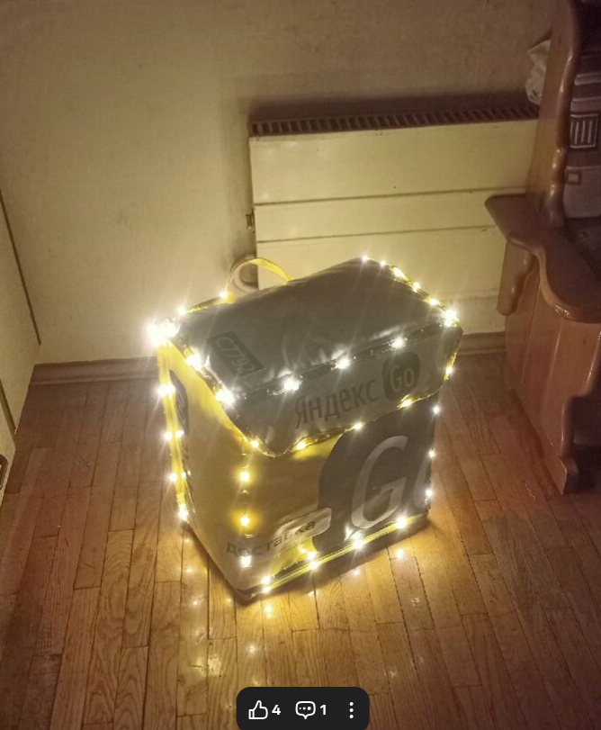 В 2021 году, когда я проработал всего несколько месяцев в доставке и приближался Новый год, решил сделать светящийся термокороб. Наперёд скажу, что идея эта была провальная изначально, плюс ещё и опасная, но я был настолько преисполнен провести этот эксперимент, что даже не думал о каких-то опасностях. И вот эта статья. "Тюнинг термокороба для нового года :) 16 ноября 2021 Новый год не за горами, так что готовлюсь к нему заранее. И чтобы придать большей атмосферы праздника, катаясь по улице и развозя заказы, я решил украсить свой термокороб. Также внёс несколько доработок для большего удобства и функциональности, но это не столь важно. Главное, что получилось в итоге по свету ) Обычная самая дешёвая тонкая гирлянда 5 метров (2 шт.) за 500 рублей и дешман павербанк за 260 рублей. Несколько сломанных иголок, обколотые пальцы и куча ниток ) Возможно, это перебор. Кому-то не понравится. Но мне нравится результат. Даже если убрать эстетическую составляющую, то с практичной точки зрения мен
