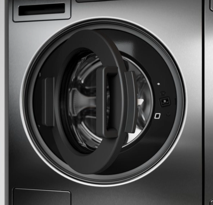 Дверца фронтальной загрузки увеличенного диаметра снабжена промышленными петлями и закалённым стеклом, выдерживающим перепады температуры. Петли рассчитаны на десятки тысяч циклов, что соответствует требованиям коммерческой эксплуатации.