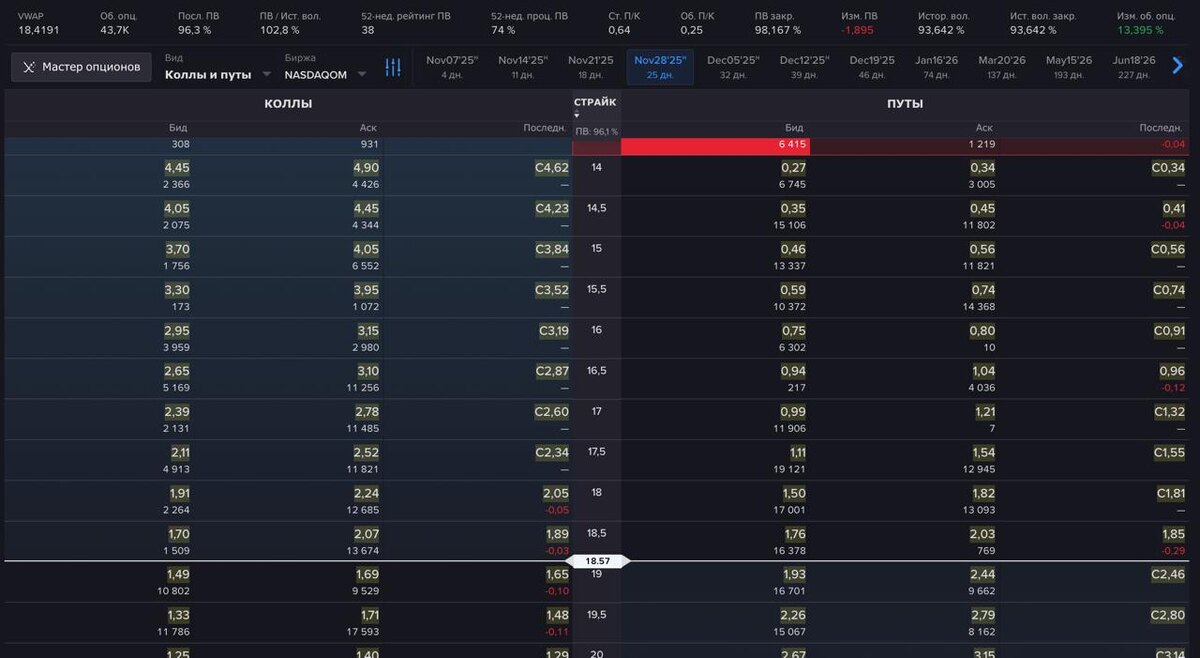 Фармить премию или сидеть в кэше? После выхода из позиции по MSTR часть капитала освободилась. И пока большинство ждёт «обвала», можно фармить страх и превращать его в доход. Как? Продавая путы — те самые страховки от падения рынка. Когда все боятся, премии растут. А сейчас — именно такой момент. Взглянул на опционы MARA (Marathon Digital, топ-3 биткойн-майнер в США). Экспирация — 28 ноября. Текущая цена $18.57. Варианты: — Страйк $13 → премия $17 → 15.6% годовых при риске 6.9% — Страйк $17.5 → премия $175 → 76% годовых при риске 36% По сути, риск — выкупить акции по страйку, если цена туда упадёт на день 28 ноября. Рынок не верит в рост, но премии выглядят жирно. Я вот думаю: стоит ли брать повышенный риск ради быстрой прибыли, или остаться в кэше и подождать входа ближе прояснению ситуации? Что бы выберали вы: A — Заработать 15% годовых с риском 6.9% B — Заработать 76% годовых с риском 36% C — Остаться в кэше и спать спокойно Давайте проголосуем 👇 #опционы #доходность #с