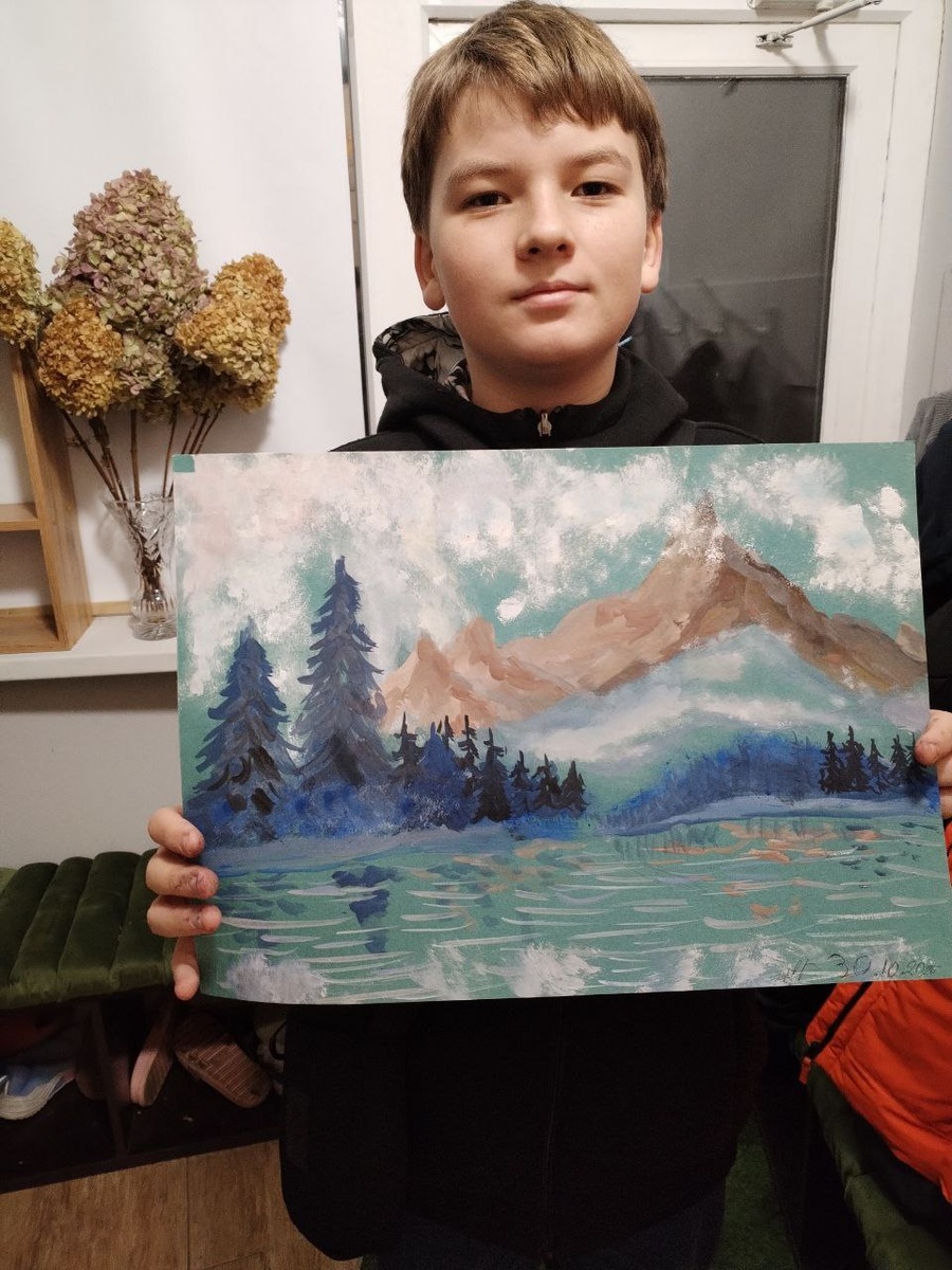 "Живописные горы" , пейзаж от Александра, гуашь.