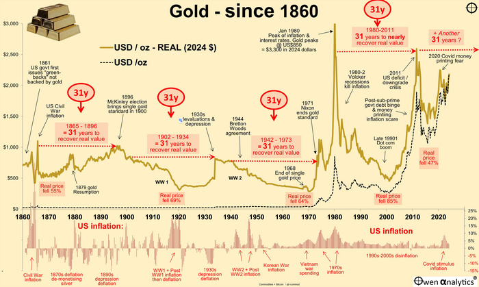 Перед вами прошлогодняя картинка одного из частных австралийских исследователей. О чём она? О золоте. На графике показана цена на золото в реальных (с поправкой на инфляцию, в долларах 2024 года) долларах США за тройскую унцию за последние 165 лет. Чёрным пунктиром выведена цена золота в номинальных ценах. А в нижней части графика представлены годовые темпы инфляции в США. О чём говорит автор? Проблема в том, что золото — плохая защита от инфляции, а также плохая инвестиция в течение большей части времени, и примерно каждые 30 лет оно подвергается огромным пузырям и обвалам. С пиков бумов реальная цена золота: Снизилась на 55 % с пика 1865 года. Снизилась на 69 % с пика 1902 года. Снизилась на 64 % с пика 1942 года. Снизилась на 85 % с пика 1980 года. Снизилась на 47 % с пика 2011 года. «Со временем обязательно вырастет! Говорили они. Люди, которые купили золото во время скачка цен в 1865 году, должны были ждать 107 лет, до 1972 года, чтобы вернуть свои деньги в номинальном выражении д