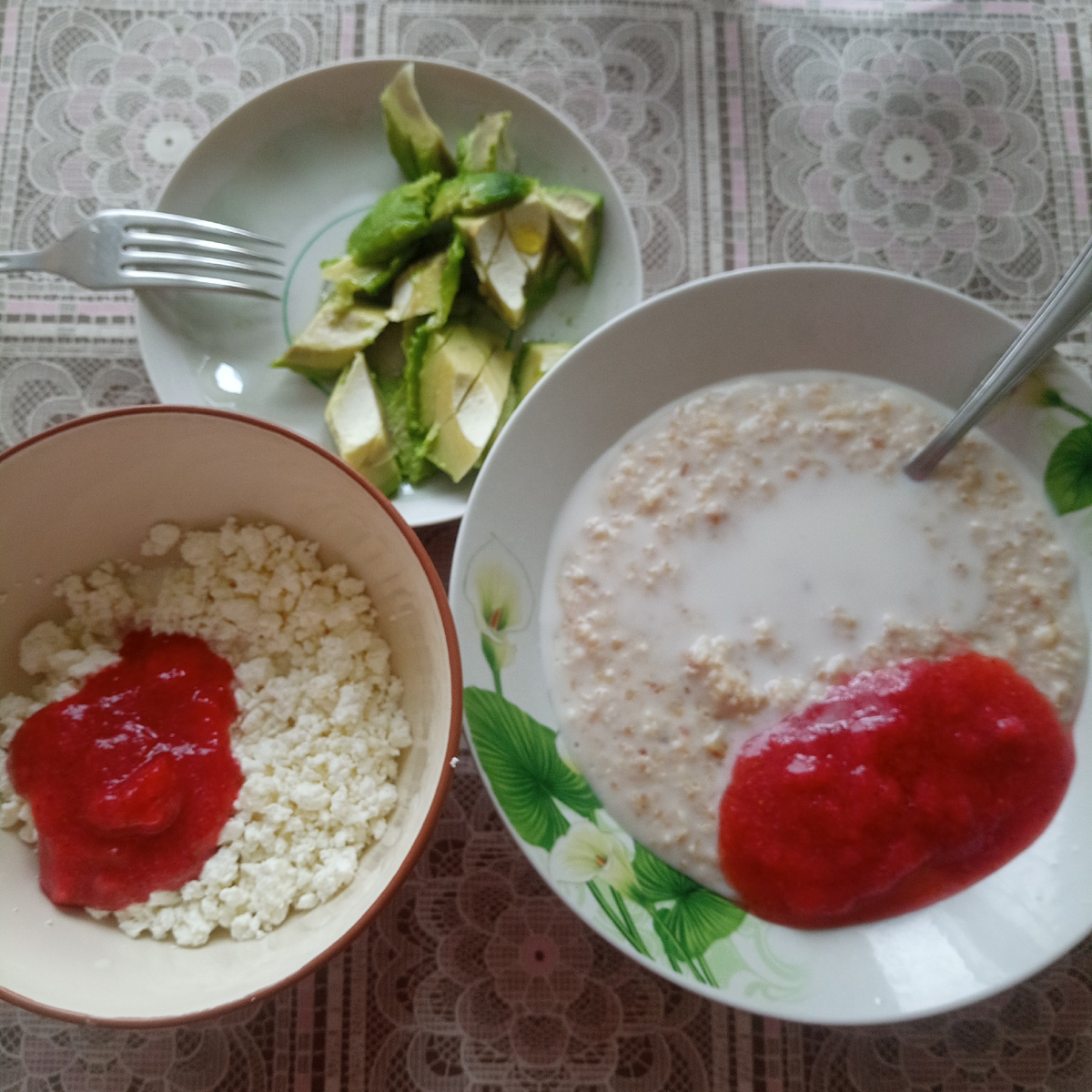 Завтрак мой состоял из каши на миндальном молоке. Мне понравилось. Конечно, хотелось почувствовать запах орешков, но увы, его не было. Добавила пюре из клубники. Пюре было и к творогу. Хотелось вкусняшки, а клубника, это всегда вкусно)). Авокадо съела с кусочком хлеба, добавив к нему оливковое масло и немного присолив. Чай остался за кадром. Завтрак получился вкусный и сытный.