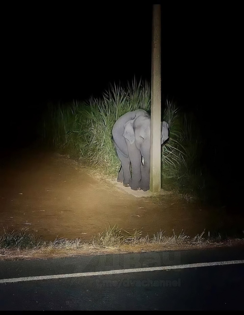 Милота дня: слонёнка застали за поеданием сахарного тростника, и он попытался спрятаться за фонарным столбом.