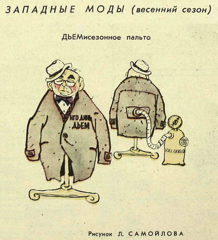 В СССР, естественно, прекрасно понимали марионеточную природу южновьетнамского режима. Иллюстрацией к чему может служить, в частности, вот этот рисунок: 1962. Лев Самойлов (1918—1988). «Западные моды (весенний сезон). ДЬЕМисезонное пальто»